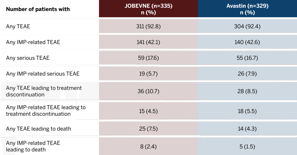 No clinically significant differences were observed between JOBEVNE and Avastin in the incidence of treatment-emergent adverse events (TEAEs) and severity of immune responses.